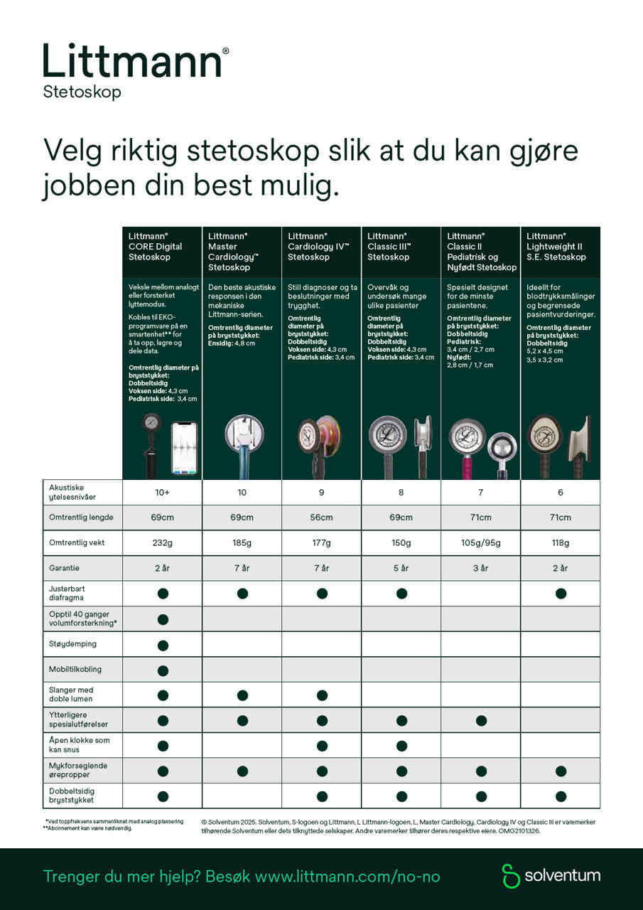 Enten du er en erfaren profesjonell eller bare begynner din reise innen medisin, har vi det rette stetoskopet for å hjelpe deg med å yte ditt beste. Oppdag vårt utvalg av Littmann® stetoskop, hvert omhyggelig laget for å møte dine behov. Fra avanserte modeller designet med innovativ teknologi til tidløse klassikere, anerkjent for sin akustiske perfeksjon, kan vårt brede utvalg av høykvalitetsløsninger hjelpe deg med å lytte etter selv de mest subtile lydene.
